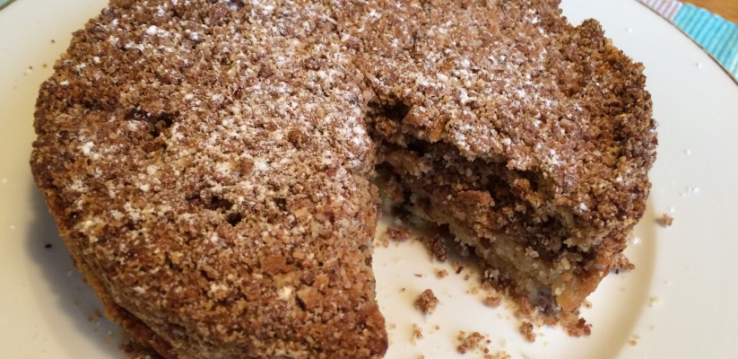 Nu var det dags för nötsmeten som enligt receptet skulle bredas ut över den första smeten i formen. Min nötsmet blev inte bredbar alls utan var torr och smulig. Jag hade ju fått ut väldigt mycket nötmjöl när jag malde mina nötter men jag hade inte tagit mer än vad det står i receptet, tror jag i alla fall. När jag stod där med min torra icke-smet så blev jag tveksam. Det var ju ingenting att göra åt det så jag hällde på nötblandningen som förutom hasselnötterna bestod av ägg och brun farin.