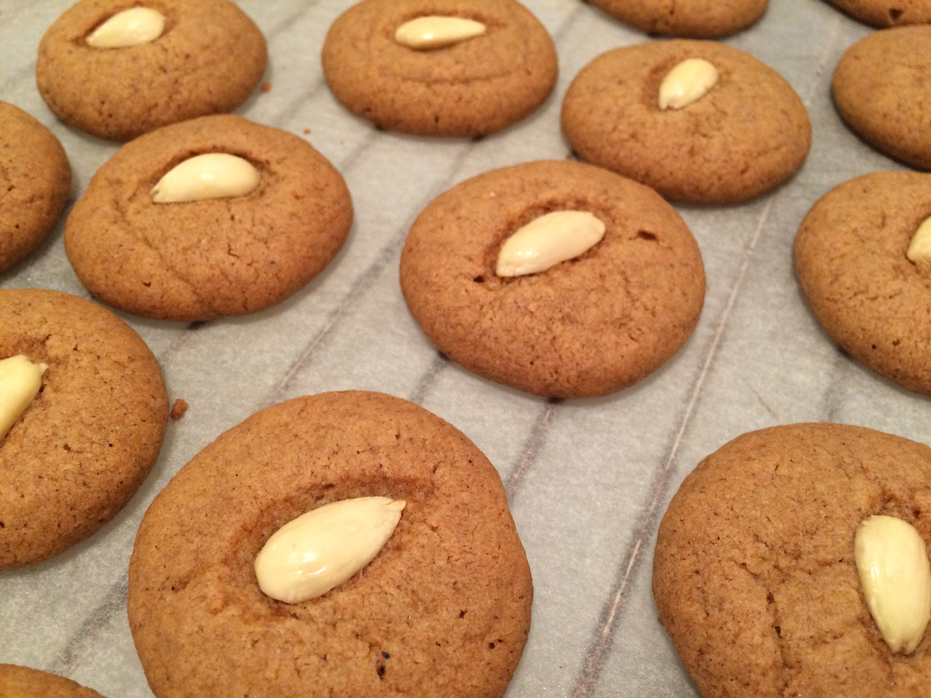 Jag såg framför mig att jag skulle få till ganska små lite spruckna pepparnötter. Det var bilden jag hade i huvudet av hur de ser ut i Danmark och så ser de också ut på bilden i boken. Men pepparnötterna som jag bakade blev ganska stora och släta. Varje pepparnöt skulle dekoreras med en skållad, skalad och halverad mandel. Det är inga problem att skålla och skala men att halvera tycker jag är så svårt. Vissa delar sig av sig själva men andra kan jag inte dela på ens med våld. Är det någon som har ett knep på hur man ska trycka, knäppa eller peta på dem för att få dem att dela på sig så berätta gärna det för mig.