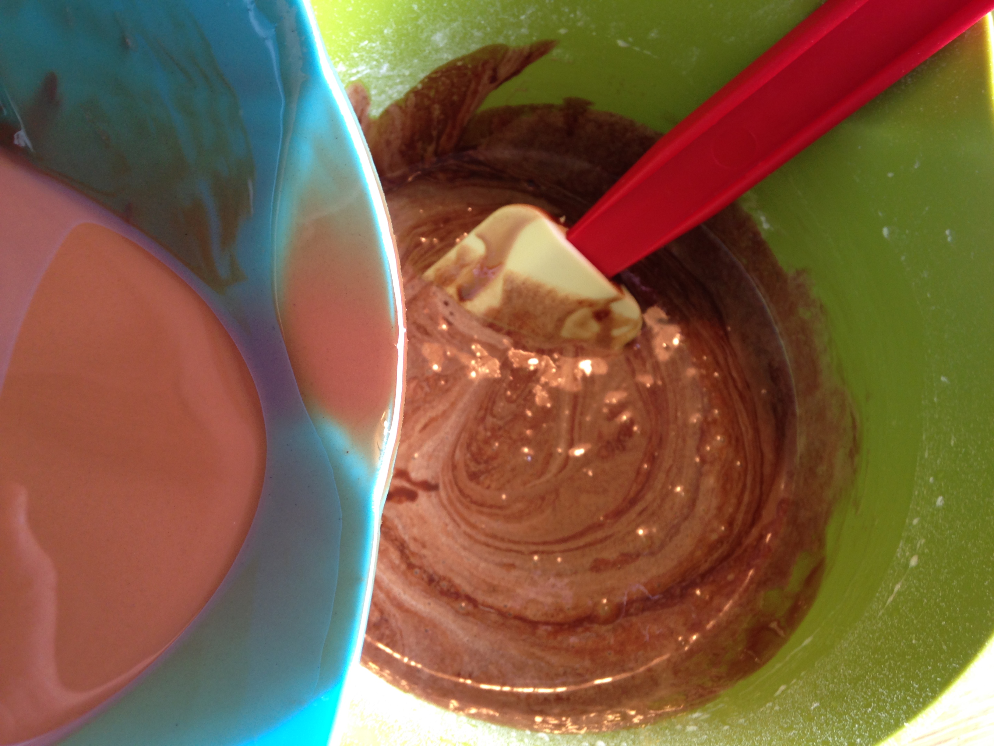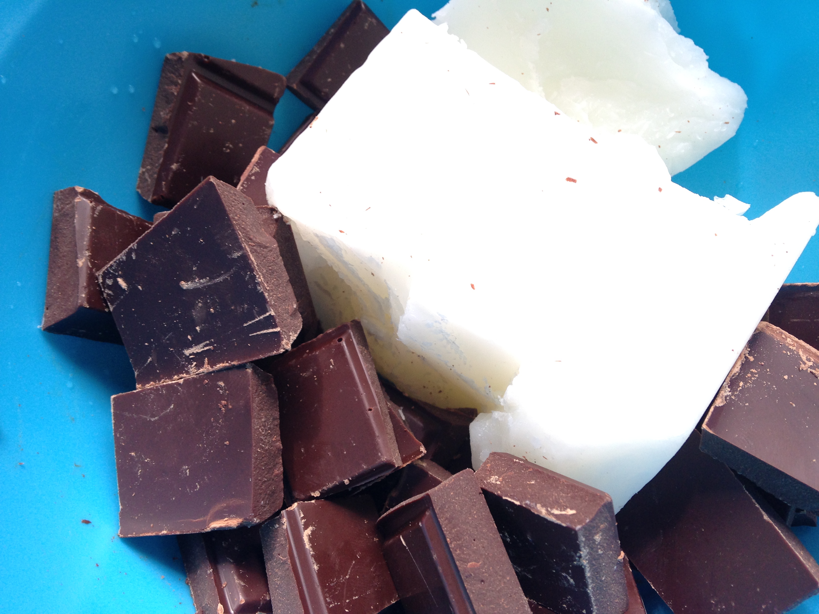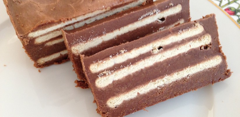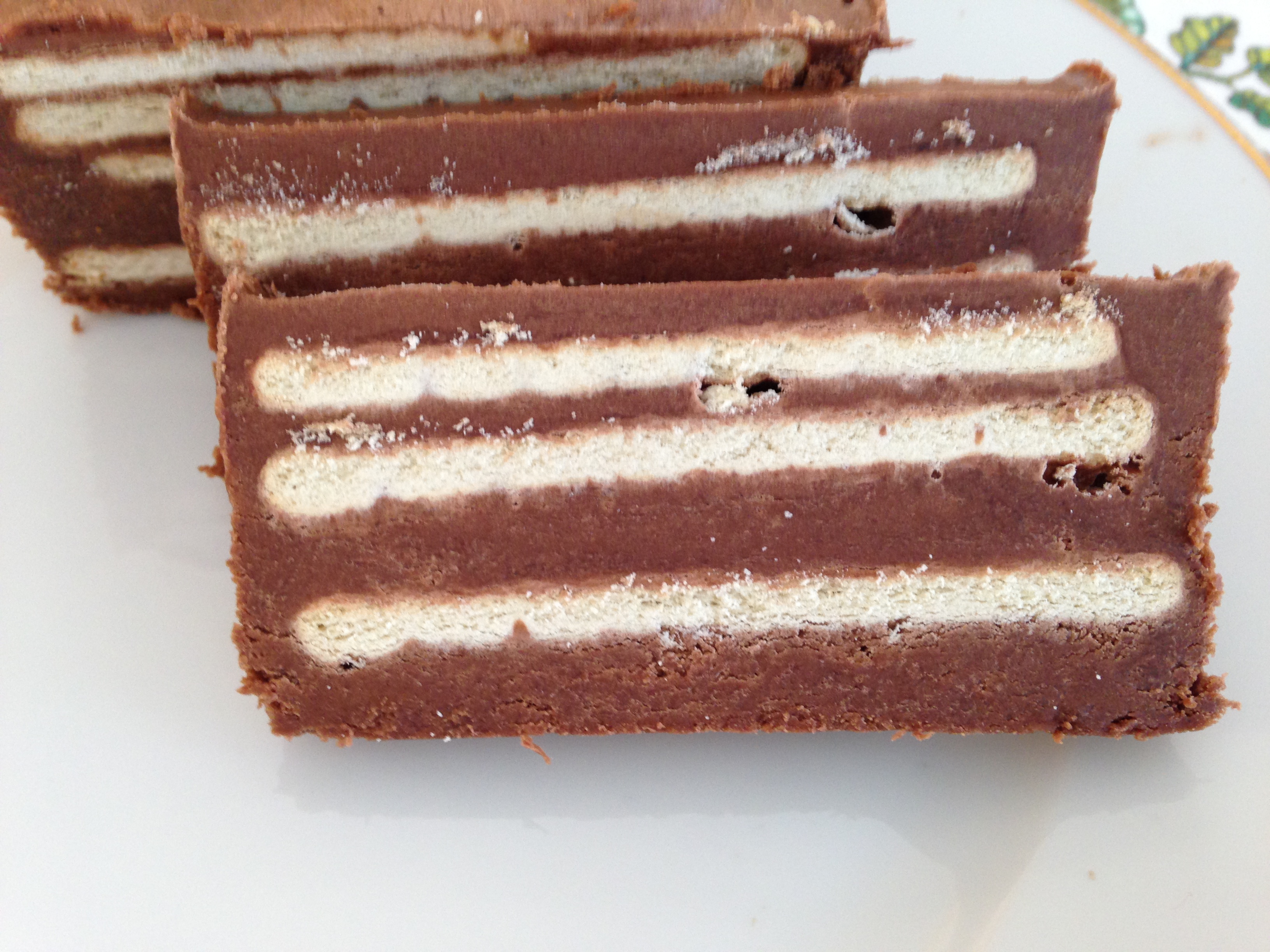 Nu gick jag till affären och köpte Mariekex. Jag stod länge och valde mellan runda kex och avlånga och beslutade mig sedan för avlånga. Det var rätt val för de passade perfekt i en avlång sockerkaksform. Kokosfett och mörk blockchoklad smältes och blandades ihop med vispat ägg och socker.