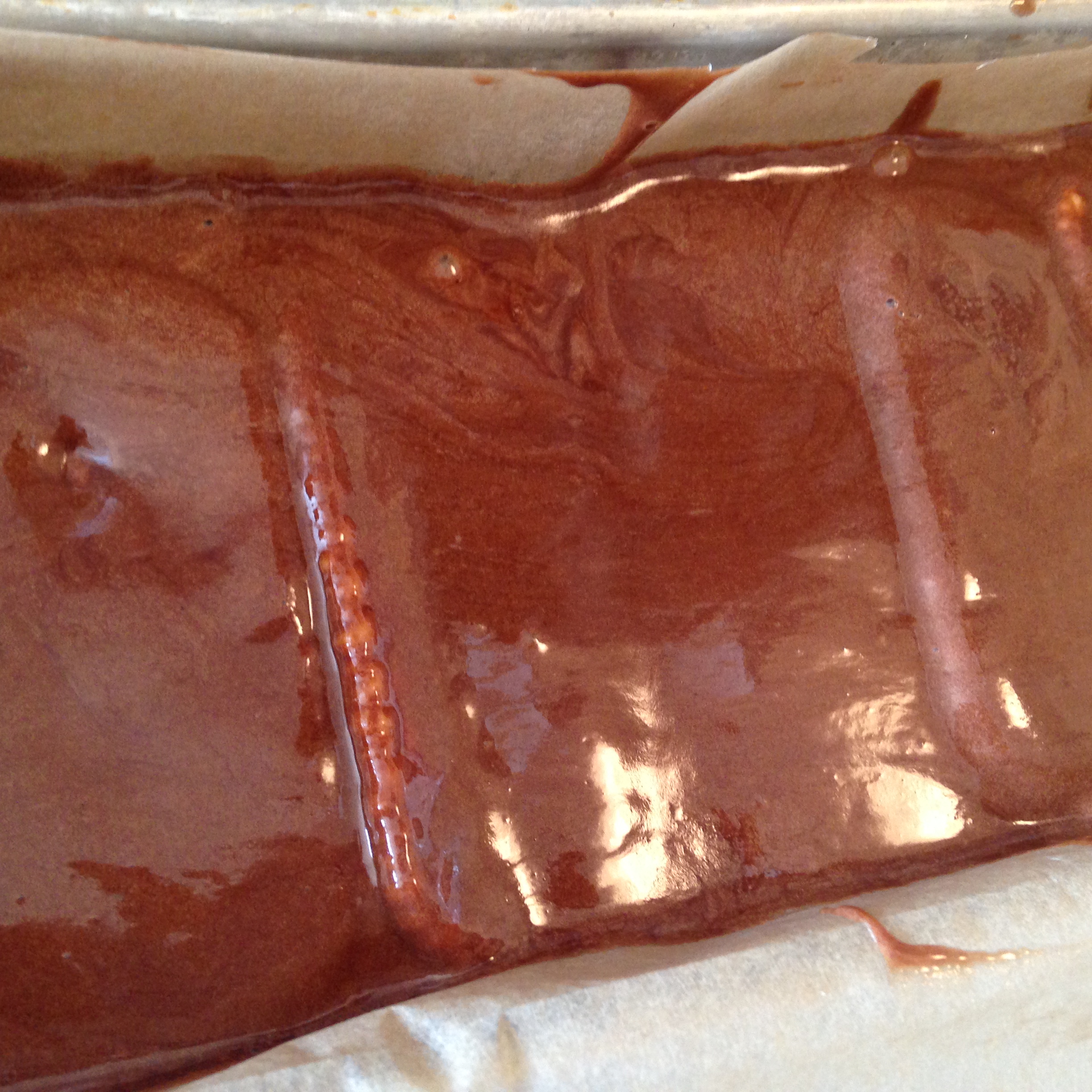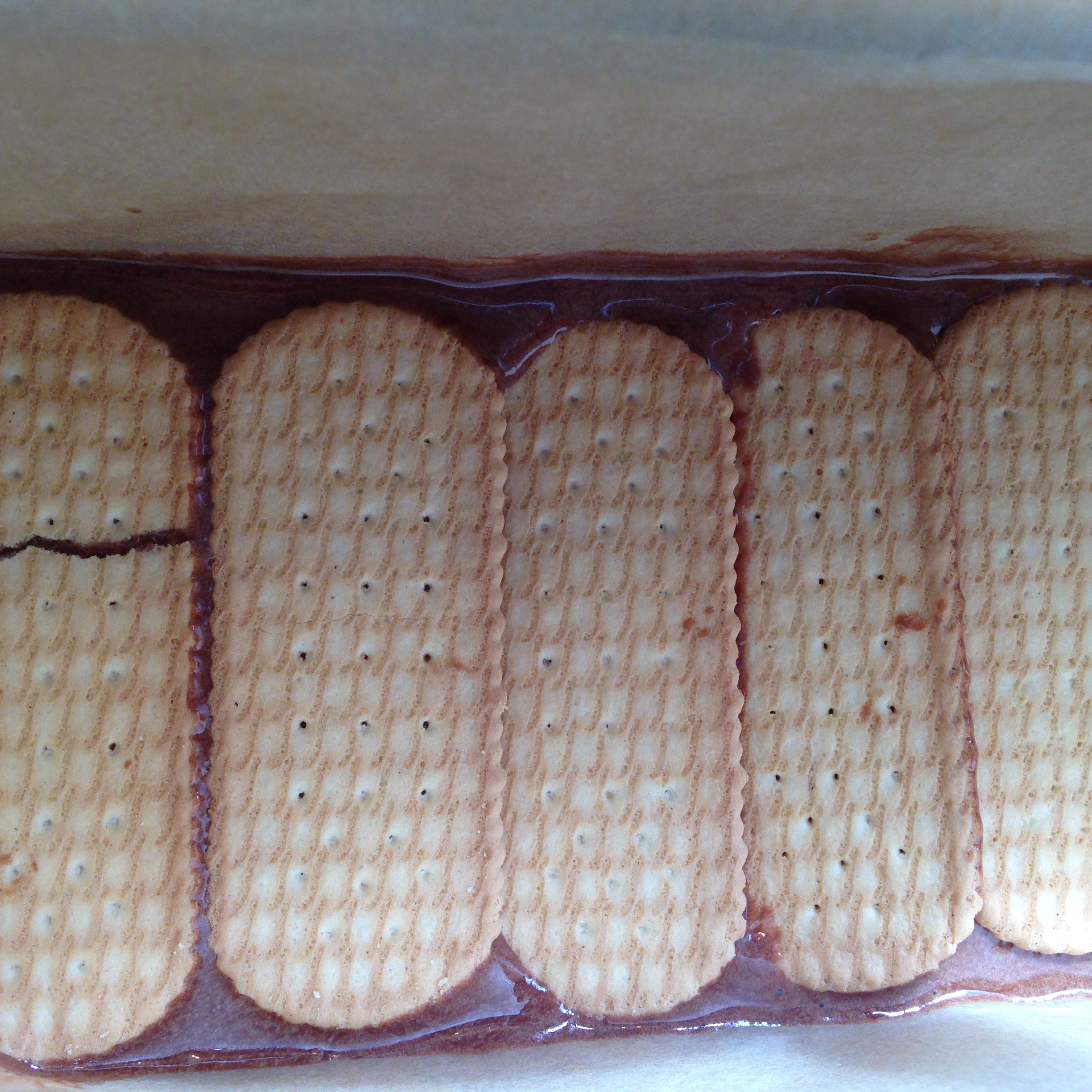 Formen klädde jag med bakplåtspapper så att det skulle bli lätt att lyfta upp kakan när den var färdig och sedan varvade jag chokladsmet med kex. Tre lager kex blev det när jag använde så många (25 st) som receptet sa att jag skulle använda. I efterhand tycker jag att jag borde gjort minst ett lager med kex till, eller kanske till och med två för det blev lite väl tjockt med choklad mellan kexen. Mamma saknade kexlager och sa att kakorna brukade ha mer kex när hon var barn och blev bjuden på kalas.