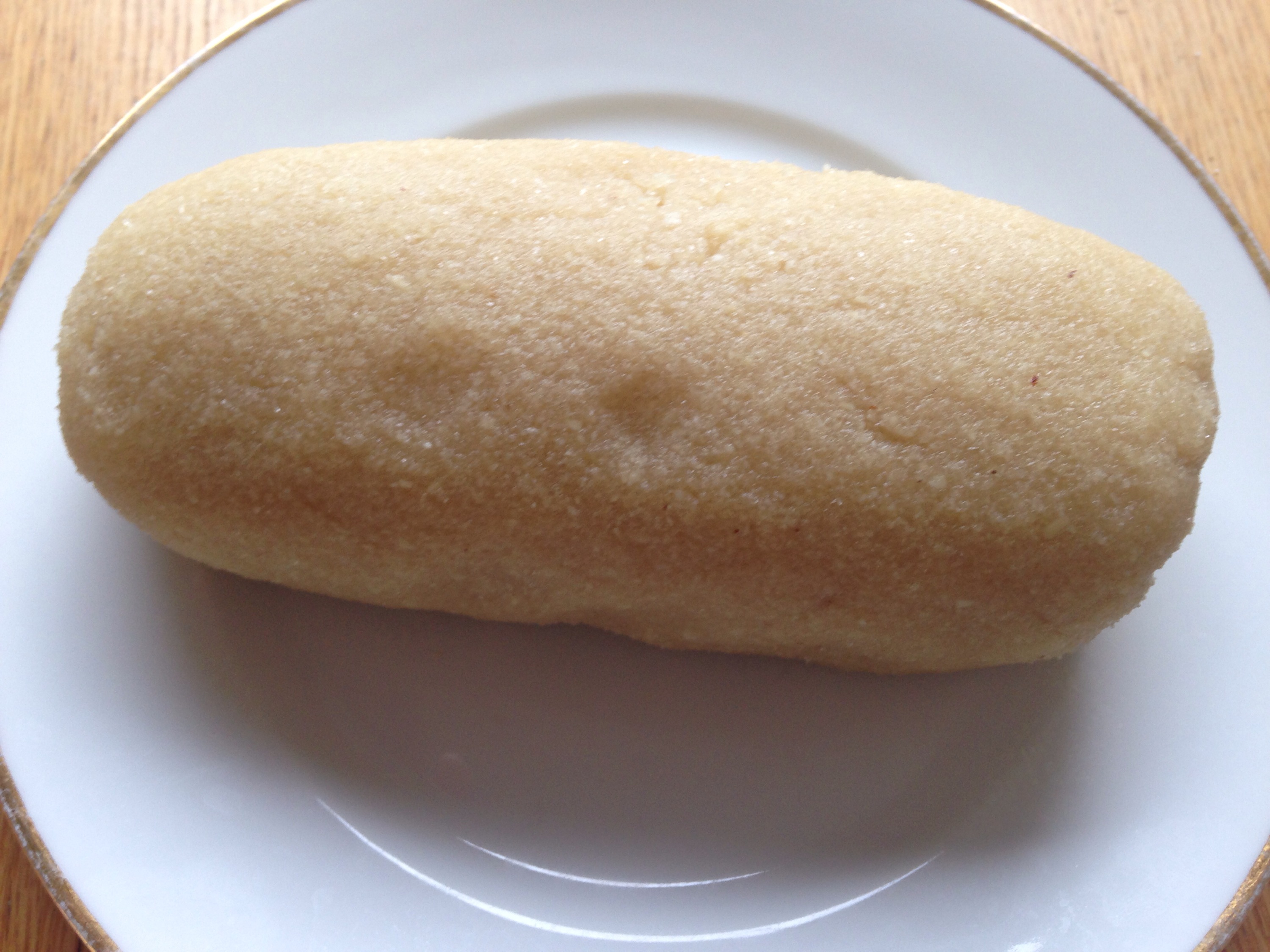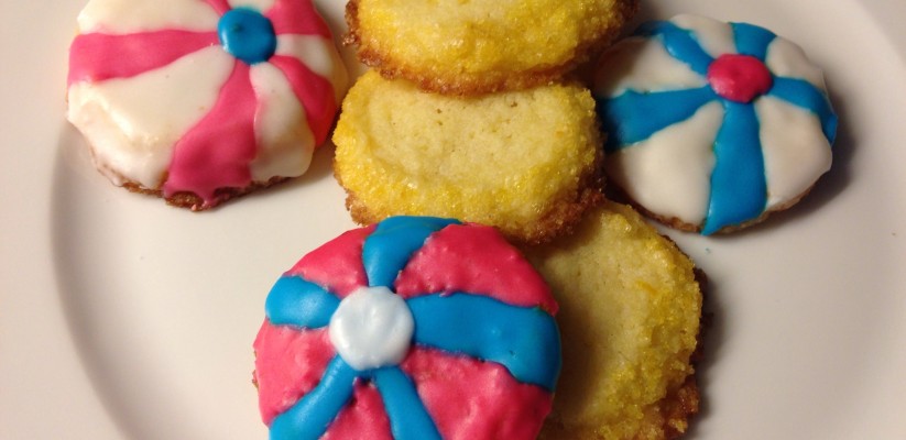 Väl färdig med mandelmassan så rörde jag ihop smör och florsocker till en jämn kräm. Därefter blandade jag i vaniljsocker, mandelmassan och rivet citronskal. Sist hällde jag i mjölet. Det blev en väldigt kladdig deg som fick stå i kylen en stund och stelna innan jag kunde rulla ut den i två längder. När sen rullarna också vilat sig hårda i kylen så penslade jag dem med ägg och rullade dem i socker. Sextio små kakor skulle det bli och jag lyckades nog få ut ungefär så många. Tre fulla plåtar fylldes med små runda degbitar. Kakorna växte i ugnen och blev jättefina. Min tanke var att de skulle dekoreras till badbollar men jag visste ju inte hur kakorna skulle bli varken i storlek eller konsistens.