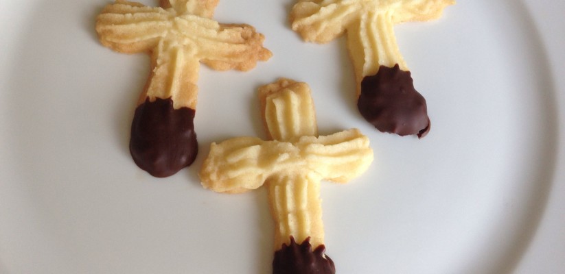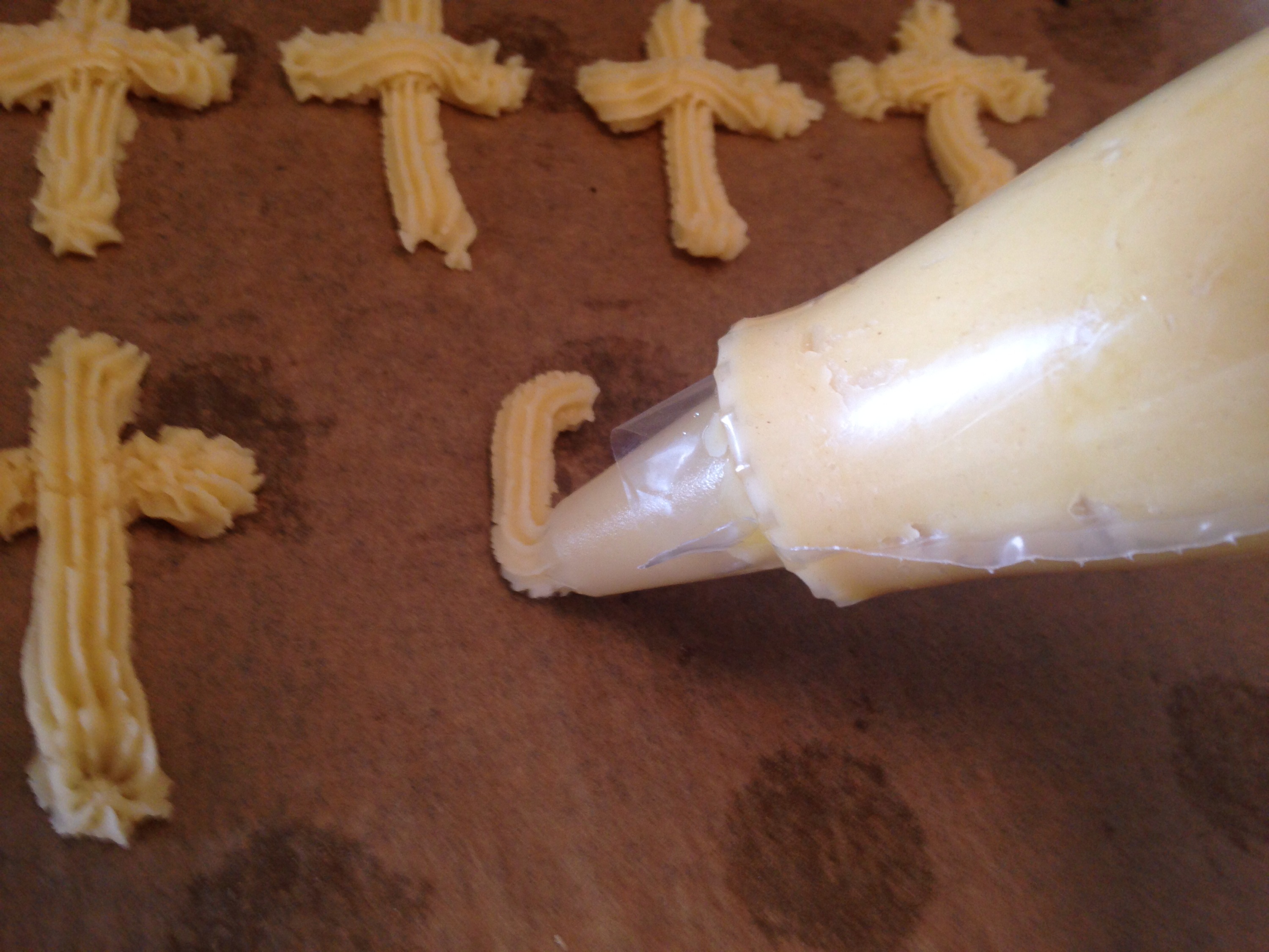 Samtidigt som jag bakade Ajakakorna så bakade jag även Strassburgare. Ännu en småkaka som ska spritsas ut på plåten. Här ges det lite frihet i receptet och det föreslås att man kan spritsa längder eller cirklar. Jag ville spritsa kors till konfirmanden.