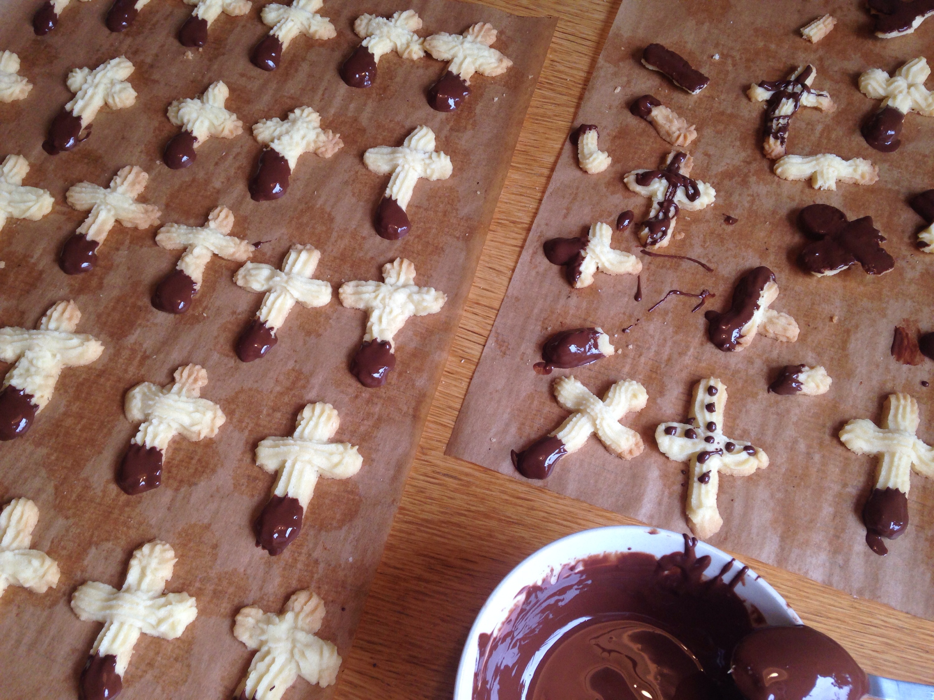 När kakorna kallnat doppade jag dem i blockchoklad som jag sedan tidigare blandat med kokosfett. Eftersom att kakorna är så tunna så tänkte jag först doppa undersidan i choklad för att ge dem stöd underifrån och samtidigt tjocka till dem. Men jag tänkte att om nu SMHI lovat 30 grader på söndag så kommer kakorna helt att flyta iväg och kladda ihop om de har choklad på undersidan. Försiktigt doppade jag foten på korset i chokladen med framsidan neråt istället. På det viset kom bara lite choklad på undersidan av kakorna. Många kakor bröts och blev till smulor och skrafs men jag fick till ett gäng strassburgarekors som jag försiktigt med papper mellan lagren ställt i en burk i kylen.