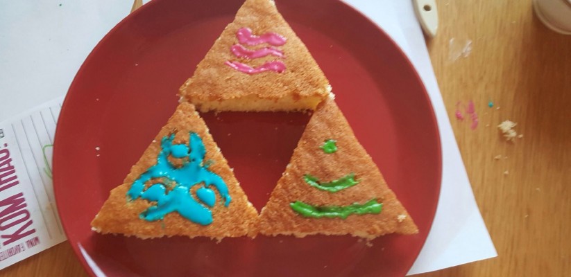 Barnen på yngste sonens skola håller traditionsenligt en stor kak- och godisknytisfest i klassrummet på skolavslutningsdagen. Sockerstinna (och ibland lätt illamående) sjunger de sedan ”We are the world” så att hela Domkyrkan gungar.Igår kväll vid läggdags bestämde sonen sig för att hans bidrag till festen skulle vara en Triforce från Legend of Zelda. Exakt vad det är vet jag inte, men det är något viktigt i spelet har jag förstått. Stort och gott med komplicerat mönster skulle det vara och vi googlade bilder istället för att läsa högt ur KP vid läggdags. Jag jobbade hårt på att övertala honom att förenkla sin idé och vi bestämde att vi skulle prata mer om det på morgonen.