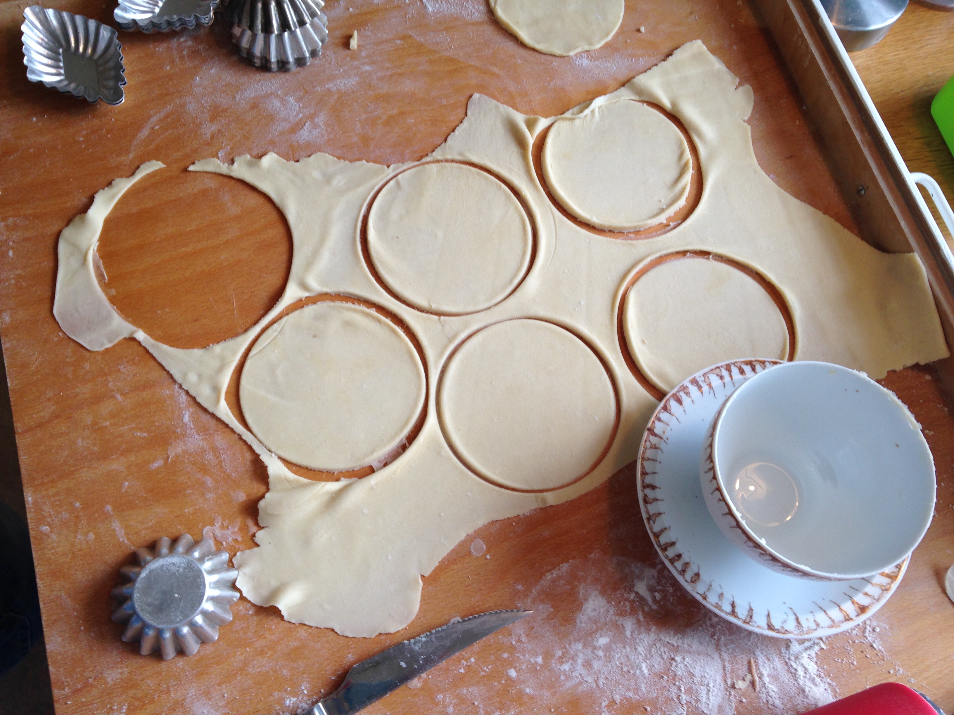 Jag gjorde degen som är en lättare variant på smördeg och kavlade ut den till en mindre fyrkant. Sedan vek jag in hörnen på den som ett kuvert, vände den upp och ner och lade in den i kylen att vila i en timme. När timmen gått så kavlade jag ut min deg till en stor fyrkant på bakbordet och stansade ut runda bitar. Jag letade runt i skåpen efter en passande storlek och hittade en såsskål som mormor målat en gång. Så nu var inte bara farmor och hjortronsylt inblandat i dessa bakelser till pappa utan även mormor.