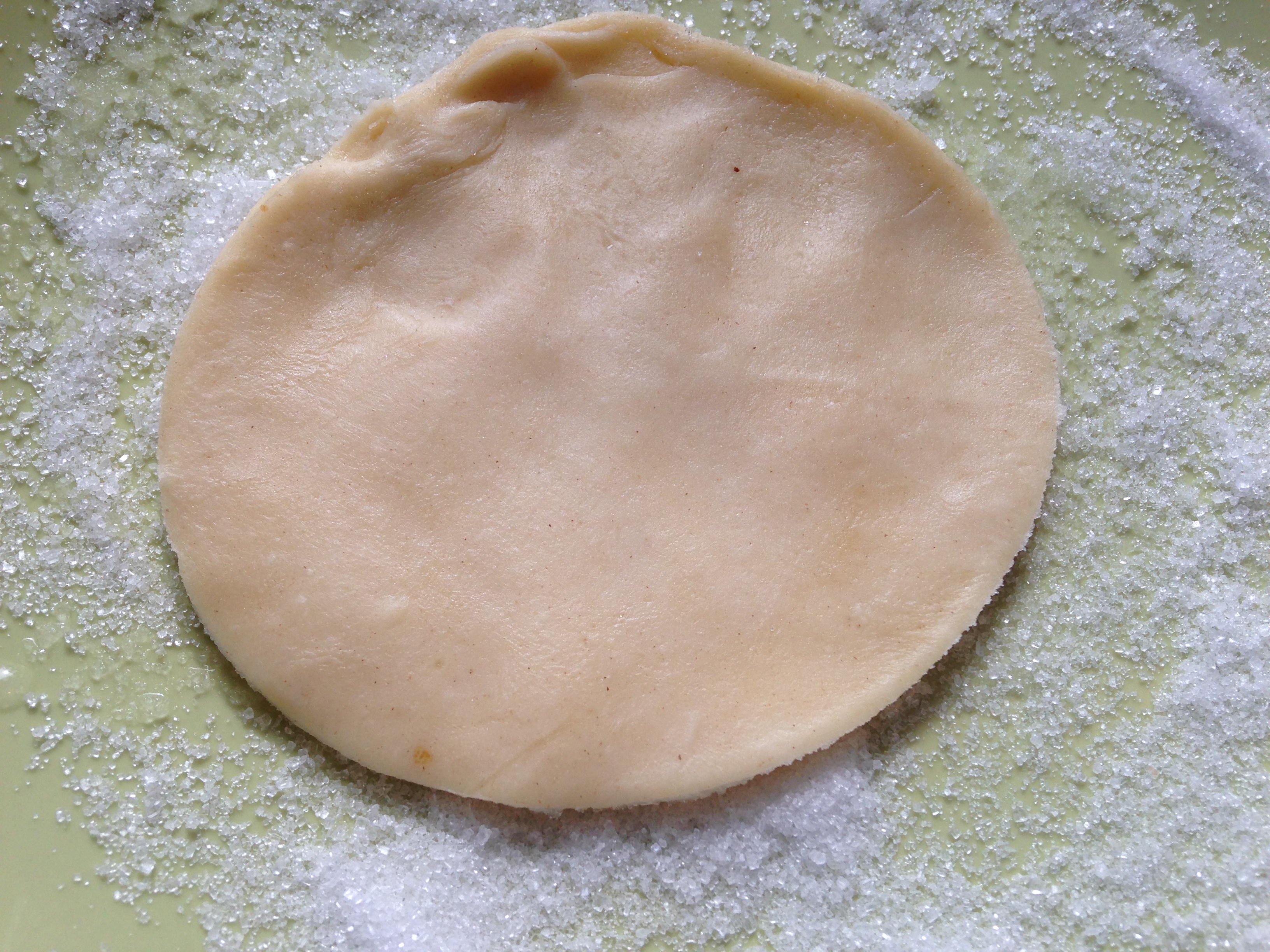 De utstansade kakorna penslades med vatten och doppades i strösocker. Jag doppade bara utsidan för att jag tänkte att om sockret smälter så fastnar kakorna på mandelmusselformarna. Det var inte helt tydligt i receptet om båda sidorna egentligen skulle doppas nämligen. Med sockret uppåt lade jag cirklarna ovanpå de upp och ner-vända mandelmusselformarna och tryckte till. Ett tips är att vara försiktig när man trycker till så att degen INTE kommer in under formen. Hälften av mina Munkekapper var lite svåra att få loss eftersom att jag klämt åt lite nitiskt och formen bakats in i bakelsen.